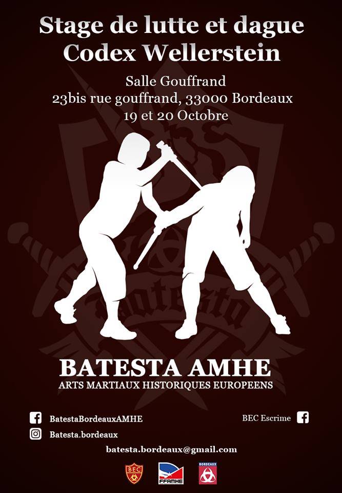 📣 Les samedi 19 et dimanche 20 octobre 2019, nous recevons Théo Flammen de l’association l’Ost du Griffon Noir Toulouse AMHE dans le cadre d’un stage de lutte et de dague selon le codex Wallerstein.